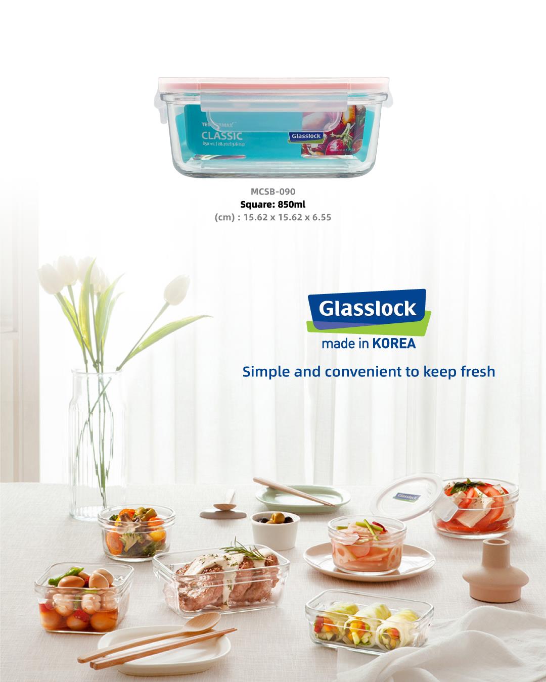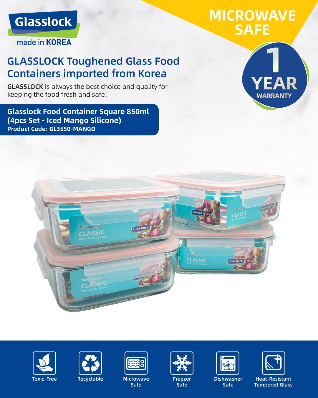 Glasslock Square Microwave Safe Food Container 850ml 4pcs Set (Iced Mango Silicone Lid)